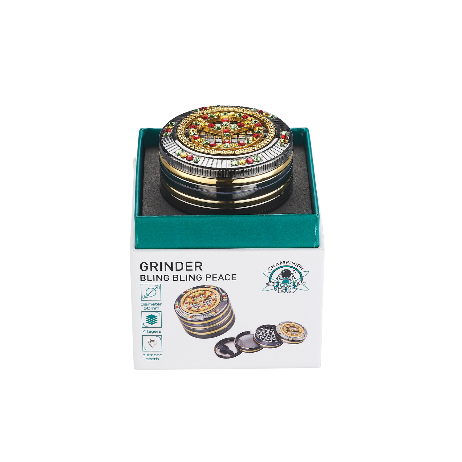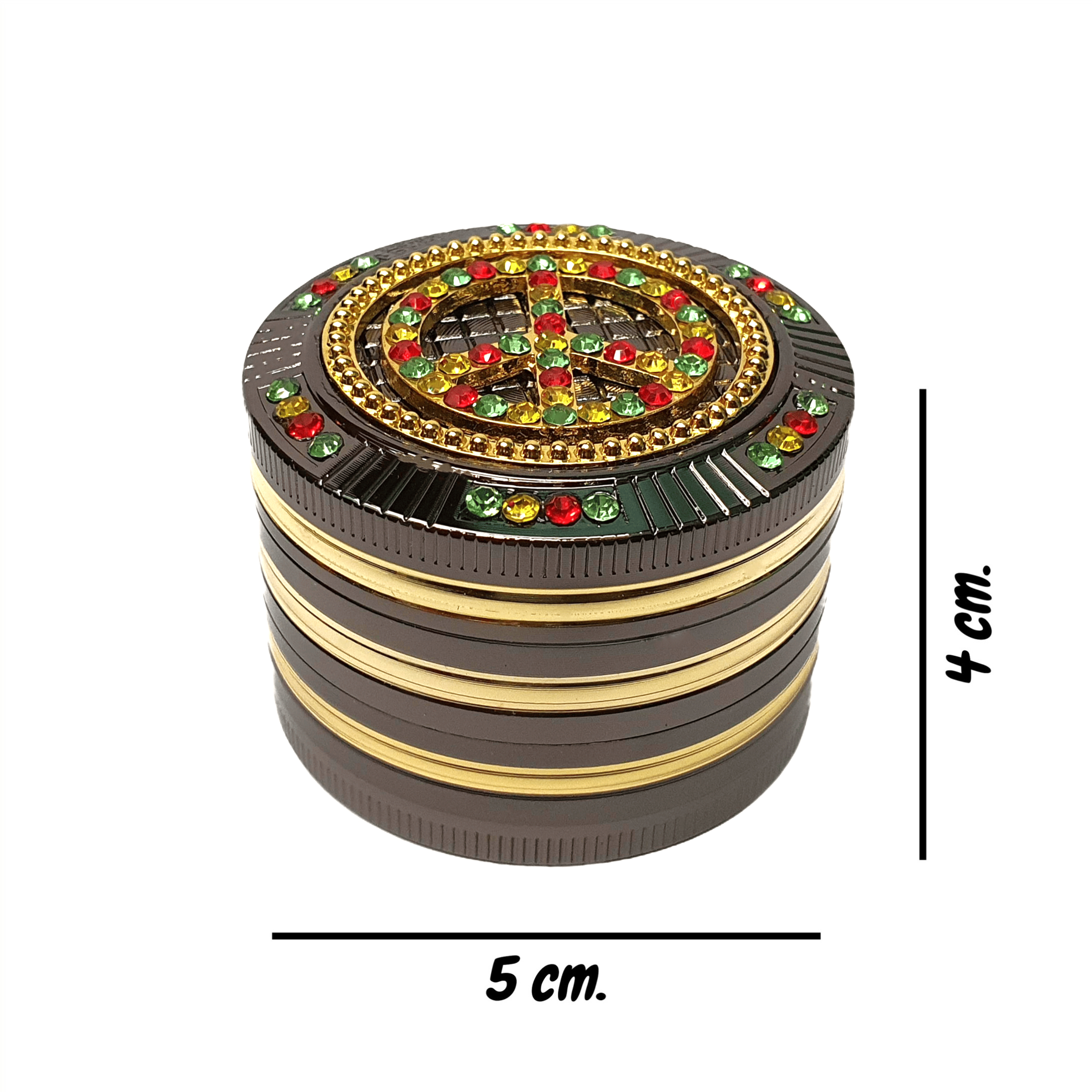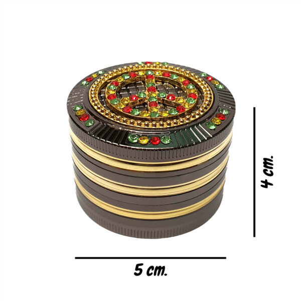 Grinder Rasta Peace Bling Bling di “Champ High” in alluminio con magnete interno.